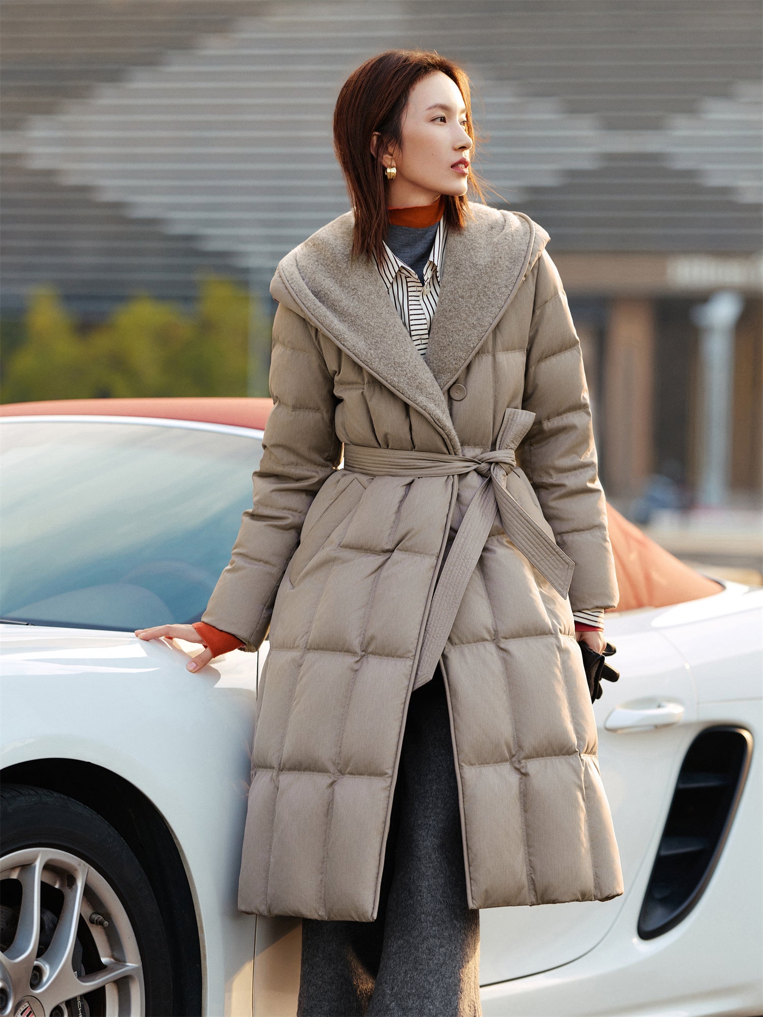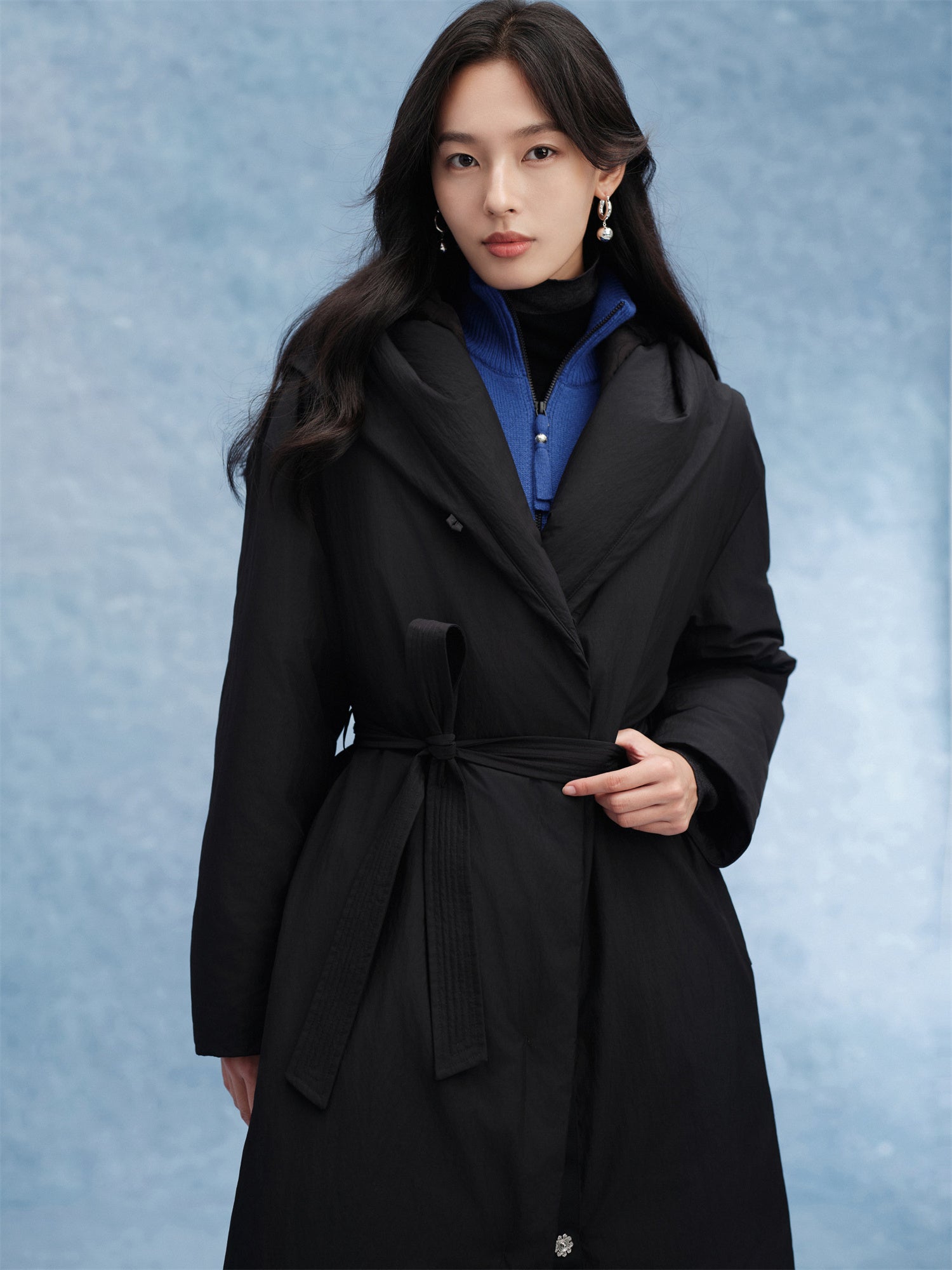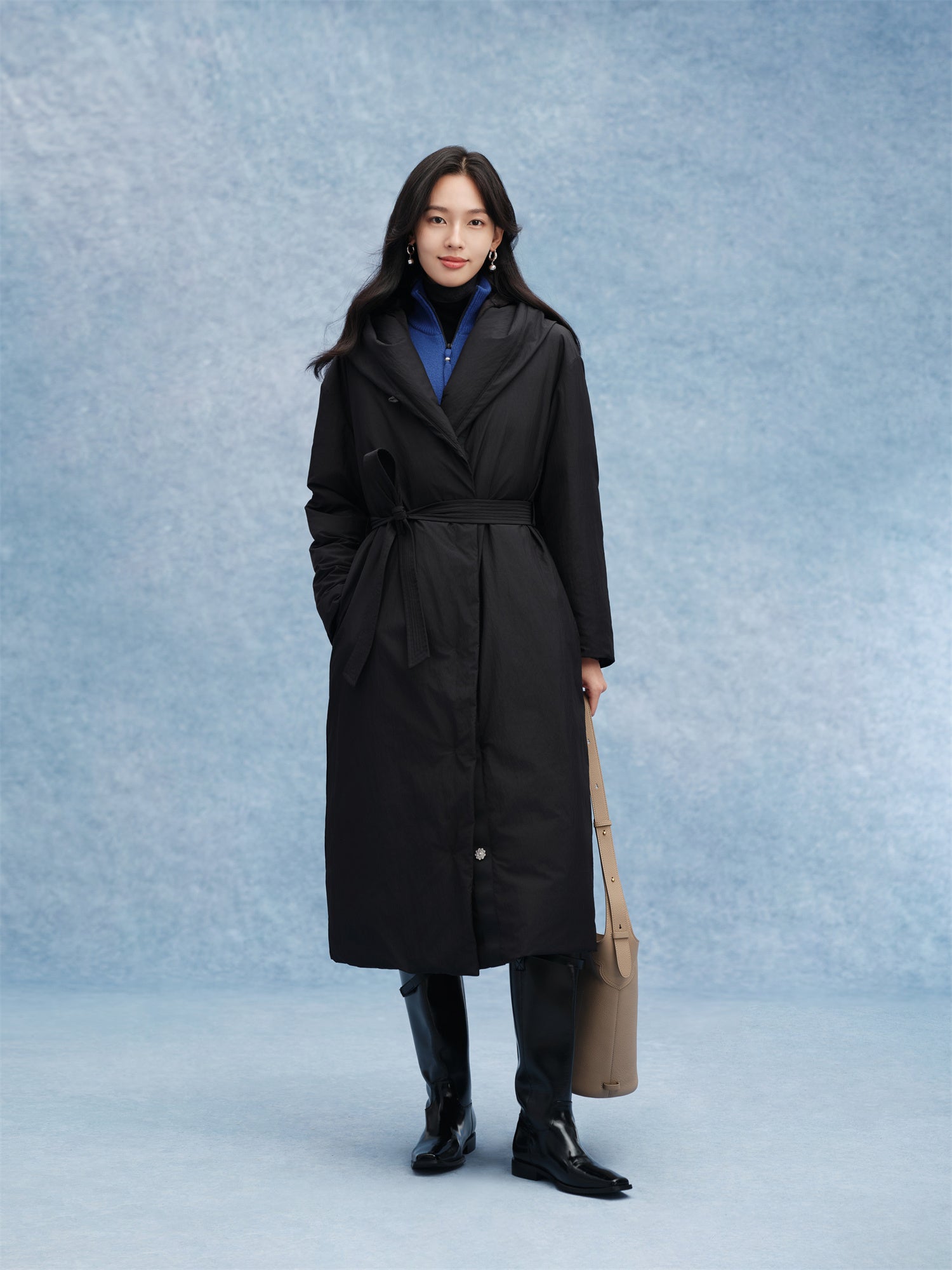 EP YAYING Long Hooded Belted Goose Down Coat